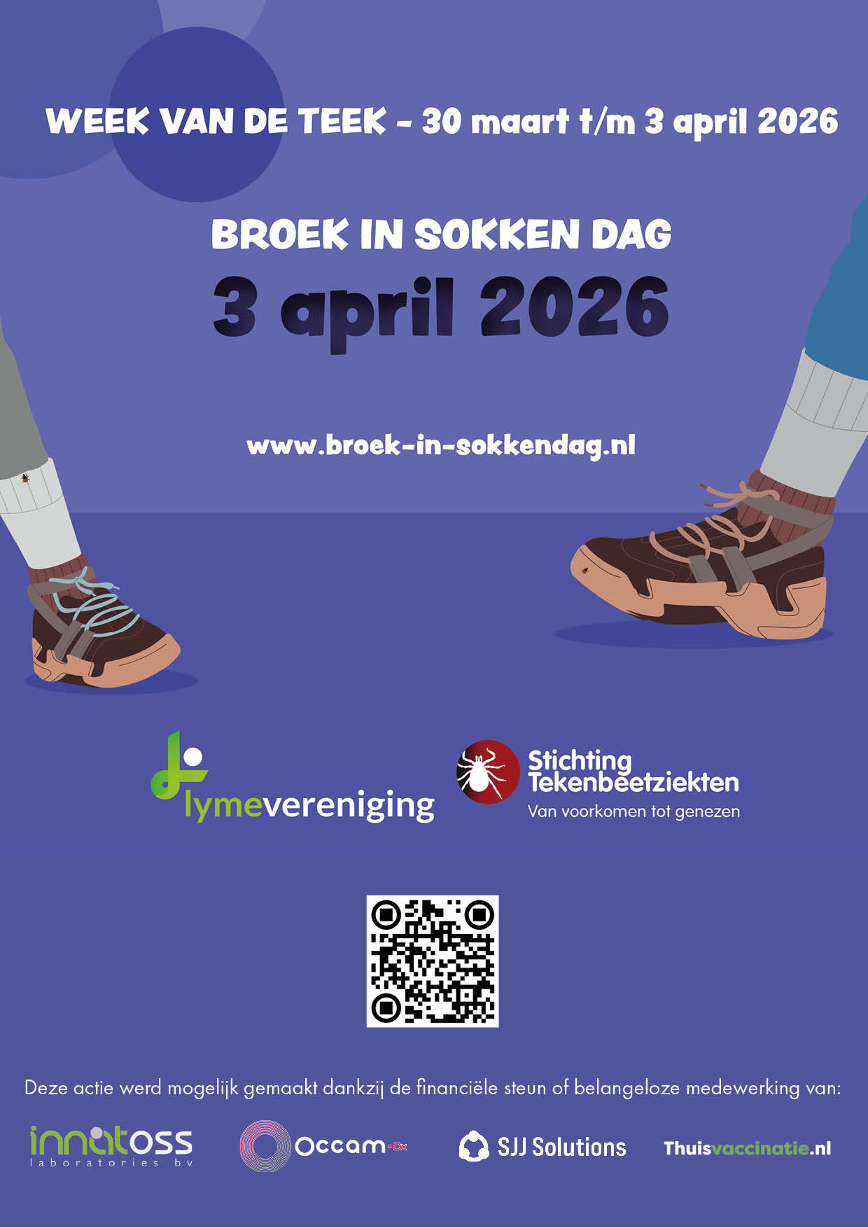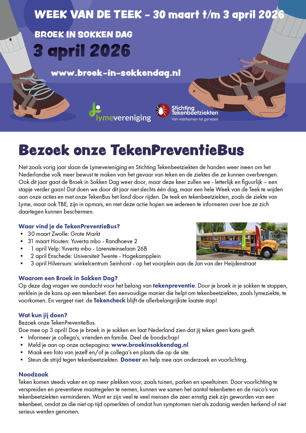 We willen met de Broek in Sokken Dag iedereen in Nederland laten weten dat het noodzakelijk is om je te beschermen tegen een tekenbeet als je de natuur in gaat. Bedenk dat teken niet alleen in het bos leven, maar óók in tuinen, parken, speeltuinen, op kampeerterreinen en voetbalvelden. Het dragen van je broek in je sokken is een heel simpele maatregel die je kunt nemen om het risico van een tekenbeet te beperken. Het belangrijkste is echter de Tekencheck: controleer 's avonds altijd je kleding en je hele lichaam op eventueel aanwezige teken!